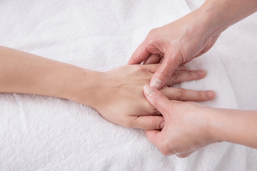 クリームを使用しながら、指先から肘にかけてほぐします。